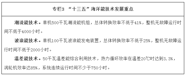 規劃提出主要目標,到2020年,海洋能開發利用水平顯著提升,科技創新能力大幅提高,核心技術裝備實現穩定發電,形成一批高效、穩定、可靠的技術裝備產品,工程化應用初具規模,一批骨干企業逐步壯大,產業鏈條基本形成,標準體系初步建立,適時建設國家海洋能試驗場,建設兆瓦級潮流能并網示范基地及500千瓦級波浪能示范基地,啟動萬千瓦級潮汐能示范工程建設,全國海洋能總裝機規模超過50,000千瓦,建設5個以上海島海洋能與風能、太陽能等可再生能源多能互補獨立電力系統,拓展海洋能應用領域,擴大各類海洋能裝置生產規模,海洋能開發利用水平步入國際先進行列。