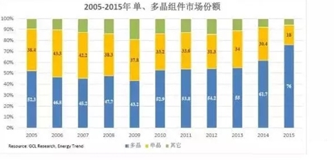 我們先來了解一些信息,圖一是05年到15年,單晶、多晶、薄膜等的市場份額變化,我們可以發現,從09年到15年,單晶、薄膜等的市場份額是不斷降低的,而多晶則在15年實現了一個井噴。圖二是日本單晶市場份額的統計數據,日本是一個國土面積十分有限的國家,對高效組件的需求應該超過其他國家,可是