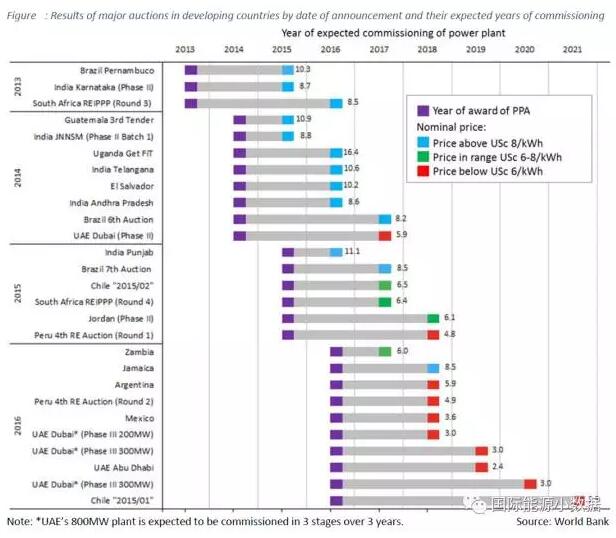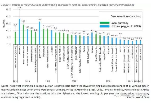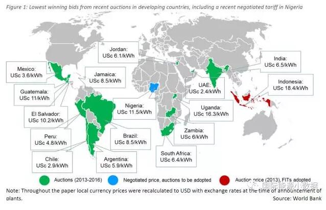 根據(jù)世界銀行一項研究,2013-2016年間發(fā)展中國家的光伏項目競標最低報價差別很大。