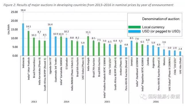 印度尼西亞的報價高達18.4美分/千瓦時,烏干達16.3美分/千瓦時,尼日利亞11.5美分/千瓦時,薩爾瓦多10.2美分/千瓦時。最低報價在5-10美分/千瓦時之間的有阿根廷(5.9)、贊比亞(6.0)、約旦(6.1)、南非(6.4)、印度(6.5)、牙買加(8.5)、巴西(8.5);最低報價在5美分/千瓦時以下的有秘魯(4.8)、墨西哥(3.6)、智利(2.9)、阿聯(lián)酋(2.4)。2016年以來的報價已經(jīng)全部都低于10美分/千瓦時。