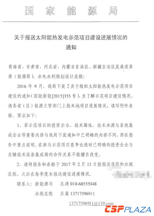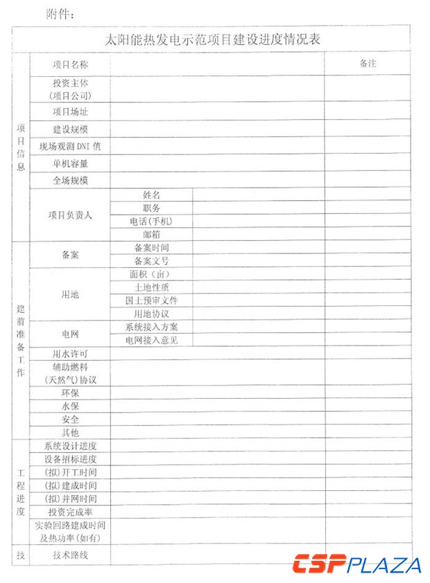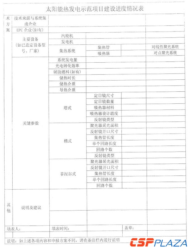 通知要求于2月15日之前將隨通知下發的太陽能熱發電示范項目建設進度情況表(見附件)填寫完畢后報送至國家能源局新能源和可再生能源司及水規總院,此后于每個季度末報送項目建設進展情況。