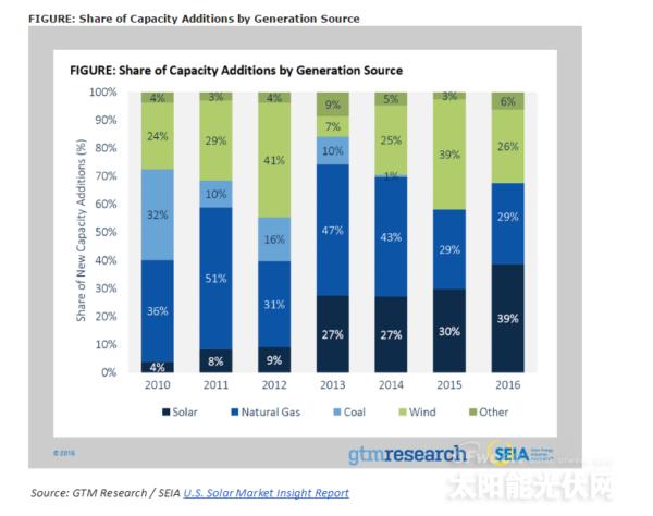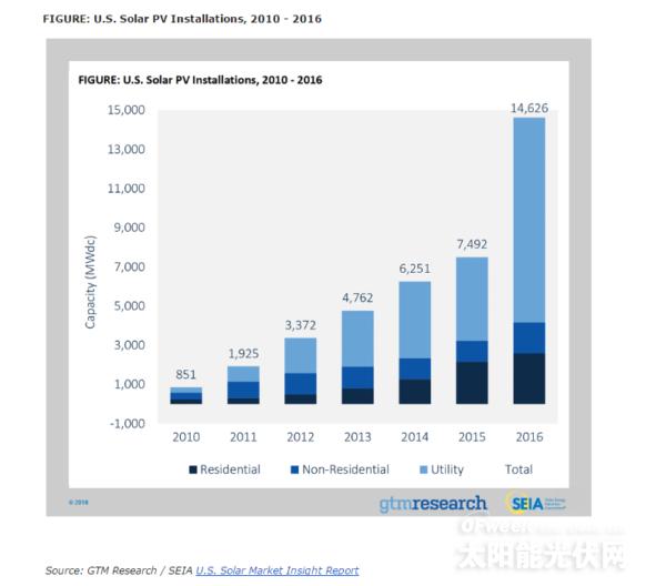 根據GTM Research和太陽能工業協會(SEIA)發表的最新數據顯示,2015年至2016年,美國太陽能市場增幅達95%,裝機量高達14.6GW。2016年是美國太陽能市場標志性的一年。