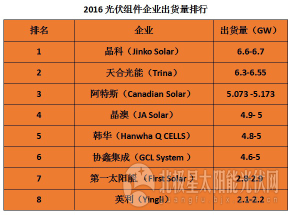 研究和咨詢公司GlobalData發布的最新報告顯示,在剛剛過去的2016年,晶科能源以6.6~6.7GW的光伏組件出貨量超越天合光能,成為TOP.1。而天合光能緊隨其后,去年出貨量為6.3~6.55GW。