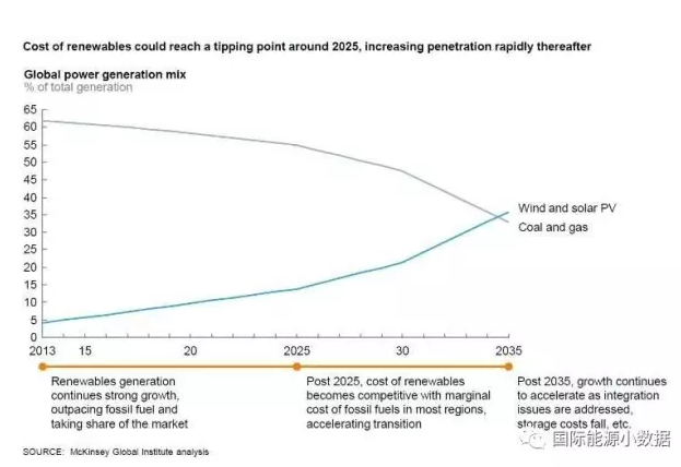 風電、光伏何時真正可以煤電、氣電競爭?知名咨詢公司麥肯錫預測,2025年將是風電光伏與煤電、燃氣發電競爭的轉折點,屆時風電、光伏成本將在全球范圍內低于煤電、氣電成本。到2035年,風電、光伏在總發電量的比例將在全球范圍內超過煤電、燃氣發電的比例。