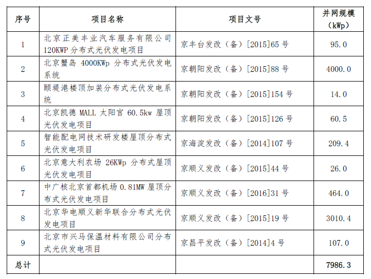 北京市分布式光伏發電項目獎勵名單(第三批)