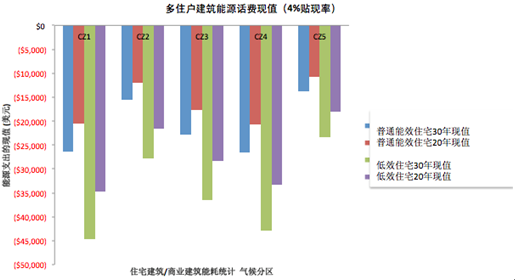 通過計算多住戶建筑平均用能支出和低效住宅建筑用能支出,落基山研究所以4%貼現率對比了多住戶建筑用能支出的現值。我們發現,凈零排放改造最具經濟吸引力的區域是第1氣候區域,第4區緊隨其后。