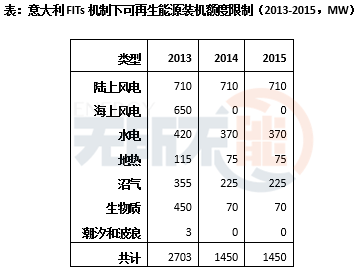 2012年7月,意大利政府發(fā)布部級(jí)法令,為退出可再生能源配額制及綠證交易和2015年后推行新激勵(lì)政策做過渡準(zhǔn)備。對(duì)除光伏項(xiàng)目類型以外,于2013年1月1日之后并網(wǎng)的1kW以上裝機(jī)容量的可再生能源項(xiàng)目,實(shí)行FITs激勵(lì)政策,同時(shí)設(shè)定了2013-2015年間每年58億歐元的激勵(lì)限額及各類可再生能源類型可享受政策支持的裝機(jī)容量額度。