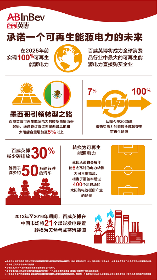 從墨西哥開始到全球其他市場,可再生能源電力目標將使百威英博每年能將其運營市場約6太瓦時的電力轉(zhuǎn)換為可再生能源,推動阿根廷、巴西、印度和南非等發(fā)展中國家的能源行業(yè)轉(zhuǎn)型,解決這些國家面臨的能源挑戰(zhàn)。增加的容量大約相當于一年內(nèi)覆蓋率超過400個足球場的太陽能電池板所產(chǎn)生的能量,將助力實現(xiàn)2015年巴黎聯(lián)合國氣候大會2015ParisClimateConference(COP21)制定的氣候目標。