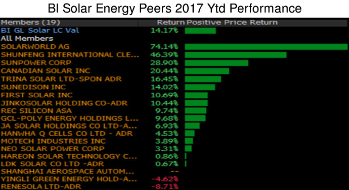 據彭博行業研究平臺數據,繼2016年52%的下跌幅度之后,2017年前兩個月,太陽能行業集團股價上漲14%。太陽能行業股市回暖,加之油價恢復到50美元左右,分析師的看法會有所改善。主要面向中國市場的順風國際清潔能源有限公司(shunfeng international clean energy)和阿特斯陽光電力集團(CanadianSolar)寄希望于今年上半年中國太陽能需求能夠增加。FirstSolar和SunPower等美國太陽能同行公司采取的削減成本的舉措也可能會緩和業內對價格和行業產能過剩的擔憂情緒。