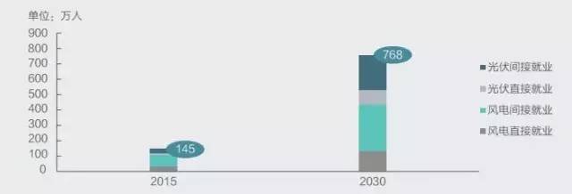 2015年,中國風光發電帶動的直接就業人口約為45萬人,到2030年增加至240萬人,較2015年增長4倍。帶動的間接就業人口由2015年的100萬人增加至2030年的530萬人。