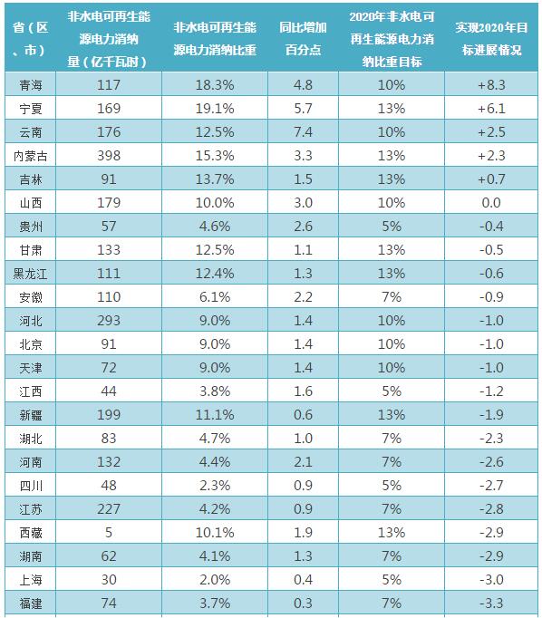 青海、寧夏、云南、內(nèi)蒙古、吉林和山西非水電可再生能源消納比重已達到2020年目標(biāo),貴州、甘肅、黑龍江、安徽、京津冀和江西接近實現(xiàn)目標(biāo),陜西、海南、廣東、遼寧和山東實現(xiàn)2020年目標(biāo)還有較大差距。