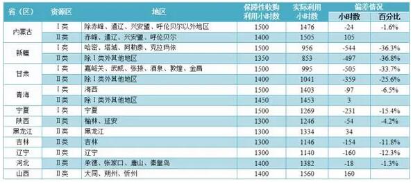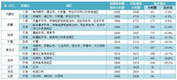 內(nèi)蒙古、新疆、甘肅、寧夏、黑龍江和吉林六省(區(qū))未達到要求,其中,甘肅全省、新疆III類資源區(qū)、吉林III類資源區(qū)實際利用小時數(shù)與最低保障收購年利用小時數(shù)偏差超過480小時。