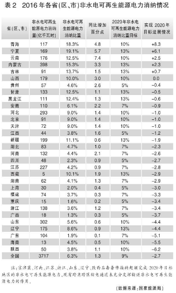 從非水電可再生能源消納比重增長來看,云南、寧夏、青海三省同比增長較快,分別上升了7.4、5.7和4.8個百分點。從完成2020年非水電可再生能源電力消納比重目標情況來看,青海、寧夏、云南、內蒙古、吉林和山西非水電可再生能源消納比重已達到2020年目標,貴州、甘肅、黑龍江、安徽、京津冀和江西接近實現目標,陜西、海南、廣東、遼寧和山東實現2020年目標還有較大差距。(詳見表2)