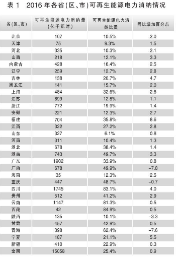2016年,包含水電在內,全部可再生能源電力消納量穩步提高,達到15058億千瓦時,占全社會用電量的比重為25.4%,同比上升0.9個百分點。其中,西藏、四川、云南可再生能源電力消納占本地區全社會用電量分別為84.9%、83.1%、81.3%,位列前三甲。其他比重較大的省(市、區)包括青海(占比62.4%)、廣西(占比49.9)、湖南(占比49.7%)、重慶(占比48.7%)、甘肅(占比42.9%)、貴州(占比41.2%)、湖北(占比38.4%)。(詳見表1)