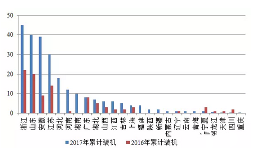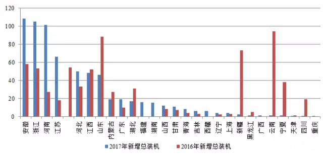 2017年新增裝機達到721萬kW,與2016年同期714萬kW基本持平,但各省的新增裝機變化大。將各省2016、2017年新增的總裝機量對比如下圖。
