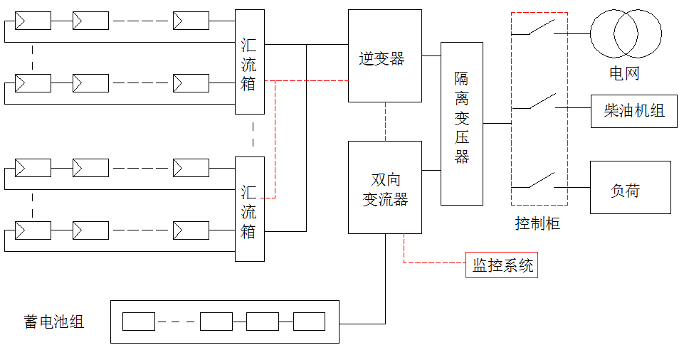 微網系統由太陽能電池方陣、并網逆變器、PCS雙向變流器,智能切換開關,蓄電池組、發電機、負載等構成。光伏方陣在有光照的情況下將太陽能轉換為電能,通過逆變器給負載供電,同時通過PCS雙向變流器給蓄電池組充電;在無光照時,由蓄電池通過PCS雙向變流器給負載供電。