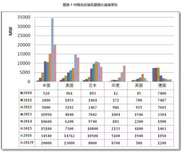 (一)中國(guó)2016年中國(guó)光伏發(fā)電新增裝機(jī)容量34.54GW,累計(jì)裝機(jī)容量77.42GW,新增和累計(jì)裝機(jī)容量均為全球第一。其中,地面電站30.3GW,分布式電站4.24GW,分布式電站同比增長(zhǎng)200%。