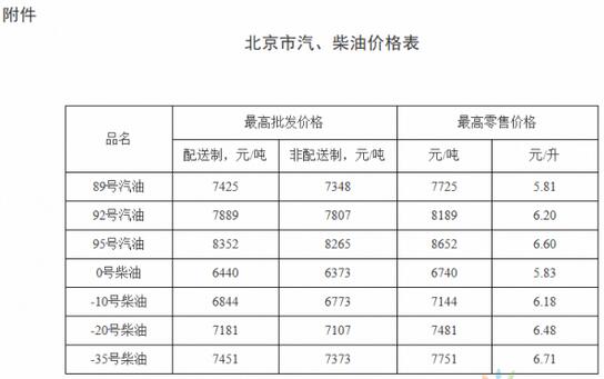 從北京市發展和改革委獲悉,根據國家發展改革委國內成品油價格調整要求,按照成品油價格形成機制,本市汽、柴油最高零售價格自2017年6月9日24時起,每噸分別降低180元和175元;89號汽油由每升5.94元調整為5.81元,降低0.13元;92號汽油由每升6.35元調整為6.20元,降低0.15元;95號汽油由每升6.76元調整為6.60元,降低0.16元;0號柴油由每升5.98元調整為5.83元,降低0.15元(具體價格見附件)。各成品油零售企業可在不超過最高零售價格的前提下,自主制定具體零售價格。本市汽、柴油最高批發價格,合同約定由供方配送到零售企業的,按照最高零售價每噸扣減300元確定;合同未約定配送的,按照最高零售價每噸扣減300元和運雜費(最高零售價格的1%)確定。