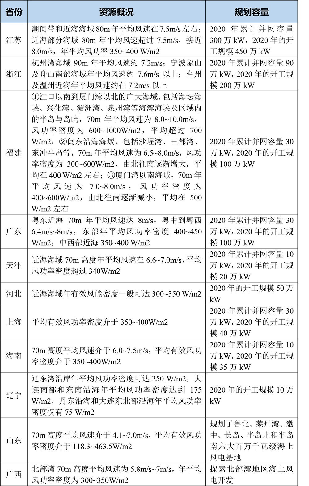 《風電發展“十三五”規劃》要重點推動江蘇、浙江、福建、廣東等省的海上風電建設,到2020年四省海上風電開工建設規模均達到百萬kW以上;積極推動天津、河北、上海、海南等省(市)的海上風電建設;探索性推進遼寧、山東、廣西等省(區)的海上風電項目。以下為開展海上風電省份的資源概況及規劃容量。