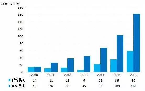 圖1:2010~2016年海上風電新增和累計裝機容量