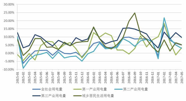 5月,分產業來看,第一產業用電量達99.99億千瓦時,同比增長3.08%;第二產業用電量3632.66億千瓦時,同比增長3.02%;第三產業用電量614.12億千瓦時,同比增長9.66%;城鄉居民生活用電量575.38億千瓦時,同比增長5.19%。
