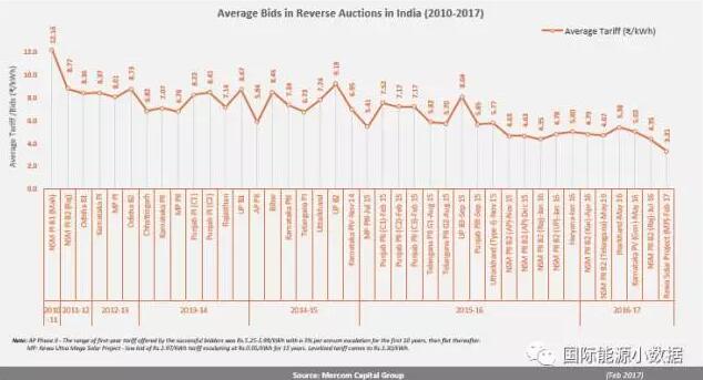 根據(jù)Mercom整理的數(shù)據(jù),2010年到2017年印度光伏項目競標報價下跌了73%。2010年10月份150兆瓦項目競標報價為12.16盧比(17美分)/千瓦時,到2016年1月已經(jīng)跌至4.35盧比(7美分)/千瓦時,而2017年最近一次競標的報價已經(jīng)低至2.44盧比(4美分)/千瓦時。