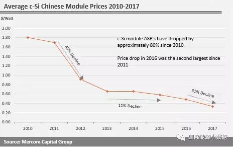印度光伏報價節(jié)節(jié)走低與中國制造的光伏電池、組件價格下降密切相關。2010年到2017年,中國生產(chǎn)的晶硅光伏組件下降了80%。2016年下降了31%,是近年來下降幅度最大的一年。
