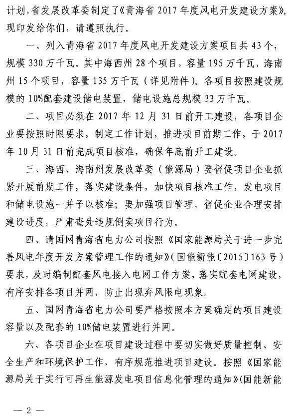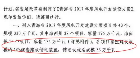 近日,青海發改委印發的《青海省2017年度風電開發建設方案的通知》中明確,2017年青海規劃的330萬千瓦(3.3GW)風電項目,各項目按照建設規模的10%配套建設儲電裝置,儲電設施總規模33萬千瓦(330MW)。