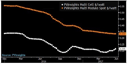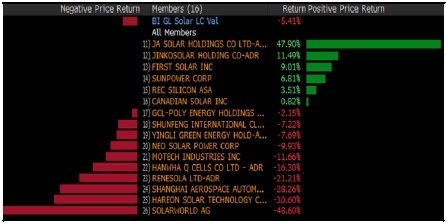 繼2016年大跌52%之后,2017年年初以來,BI 旗下行業研究的太陽能標桿企業相關股指下跌5%。市場情緒可能已經因為中美兩國貿易關系緊張(歐盟將對中國制造太陽能電池板的反傾銷關稅延長了18個月)、國際油價下跌、SolarWorld申請破產(2017年年內股價重挫49%)而進一步惡化。First Solar和SunPower(2017年股價分別漲9%和7%)這類美國太陽能企業削減成本的努力可能緩和市場對降價壓力和行業產能過剩的擔憂。