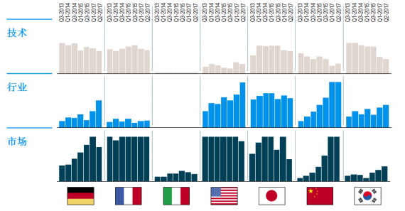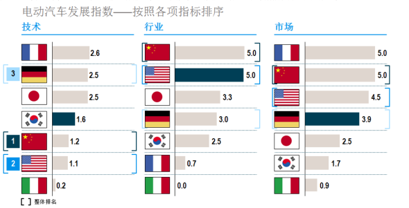 法國在技術層面居于領先地位;中國則得益于更高的產量和附加值,在行業層面保持領先;從市場層面來看,全球領先的七個汽車大國間的差距在繼續縮小。