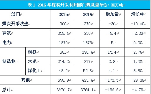 2016年能源消費增長1.4%,能源強度下降5%,煤耗量減低4.7%,主要來自民用和商業(yè)用煤的減少,以及清潔能源的替代。2016年工業(yè)部門煤炭消費量下降趨勢停滯,這種狀況令人十分擔憂。見表1,電力行業(yè)煤耗量約為18.75億噸,比2015年增長0.27%,水泥行業(yè)煤耗量約為2.17億噸,增長1.3%,鋼鐵行業(yè)煤耗量約為5.96億噸(根據(jù)鋼協(xié)會員推算全國),比2015年增長2.6%,現(xiàn)代煤化工2016年耗煤5230萬噸標煤,增長8.5%,煤炭開采和洗選耗煤2.7億噸,比2015年減少10%,建筑領域耗煤3.5億噸,比2015年減少0.2%。電力與高耗能制造業(yè)中的鋼鐵、水泥和煤化工2016年煤耗比2015年增加2730萬噸,增長約1%。