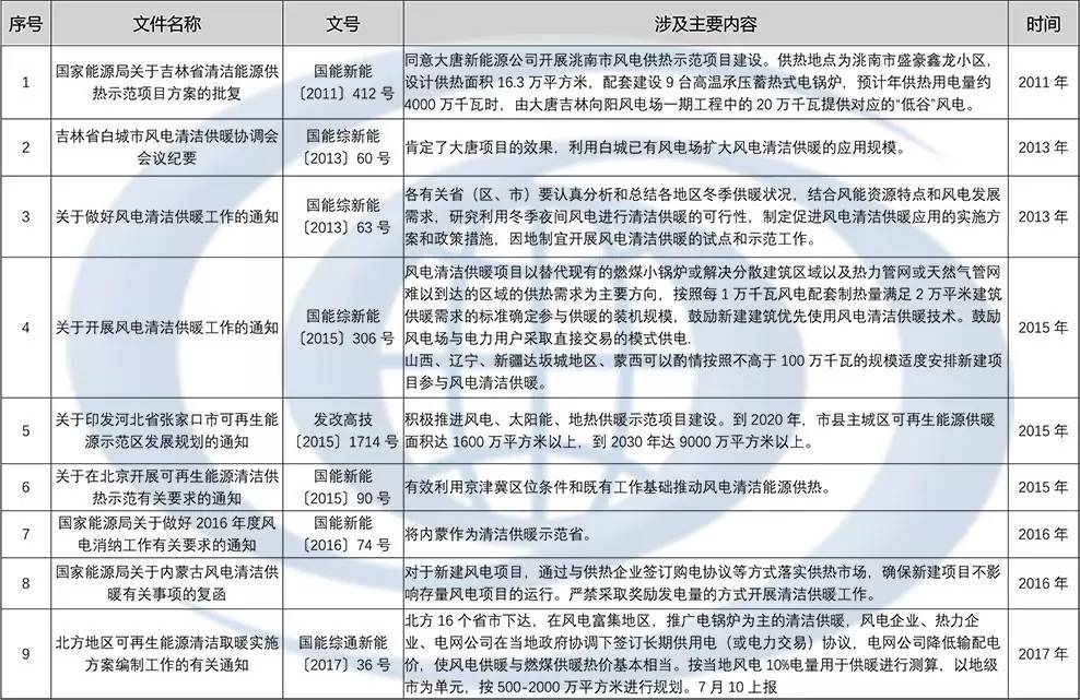 風(fēng)電供暖是解決北方地區(qū)風(fēng)電消納的途徑,也是環(huán)保、減排的需要。從2011年大唐吉林白城風(fēng)電供暖示范項(xiàng)目以來,國家出臺了一系列的相關(guān)政策,本文對這些政策進(jìn)行了梳理,介紹如下: