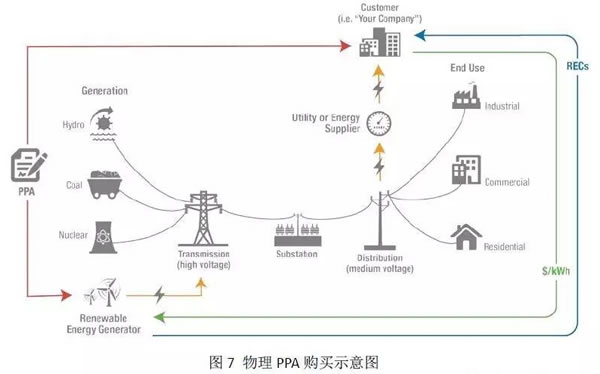 PPA 通常是用戶和電廠直接簽訂的購電合同,電價固定,合同通常持續時間為10-20年,PPA還可以分為場內(On-Site)和場外(Off-Site),本文中的PPA均指場外。用于綠電的PPA又可分為兩大類,一類是物理意義上的PPA,一類是金融意義上的虛擬PPA(VPPA)。其中物理意義上的PPA流程如圖6:
