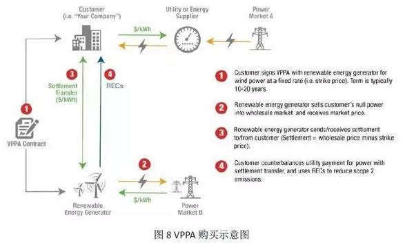 VPPA通常是采用差價合同的形式,雖然用戶和電廠簽訂了VPPA,固定了電價,但兩者實際仍在電力批發市場進行買賣。之后,用戶和電廠根據VPPA中電價與市場價的差額進行二次交易,多退少補,同時電廠將相應的REC給到用戶。