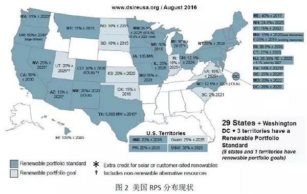 其中,強制市場主要發生在批發市場,是為滿足當地的可再生能源配額目標(RPS)而產生的,目前美國已有29個州以及華盛頓哥倫比亞特區實施了RPS(圖2)。由于配額目標多針對電力供應商,即要求其提供給用戶的電量中有一定比例的非水可再生能源電量,所以電力供應商是強制市場的主要買方。為滿足配額要求,電力供應方或通過提高自身非水可再生電力供應比例,或選則在強制市場購買綠證,電力供應商的履約成本將均勻傳導至其供電范圍內的所有用戶。