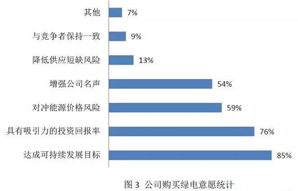 普華永道(pwc)曾在2016年對總部在美國的部分大型公司做了一項關于購買綠電的調查,涉及行業包括IT、零售、制造、金融、健康、醫療等。調查范本中72%的公司購買了綠電,而完成公司內部的可再生能源目標是購買綠電的首要原因(圖3)。