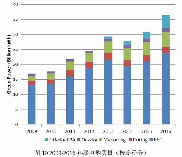 以2015年為例,美國自愿綠電市場的交易電量已經占據了非水可再生能源電力交易的四分之一(圖1)。自愿的綠電市場與為滿足配額制要求而存在的強制市場相輔相成,共同促進了美國可再生能源的發展。