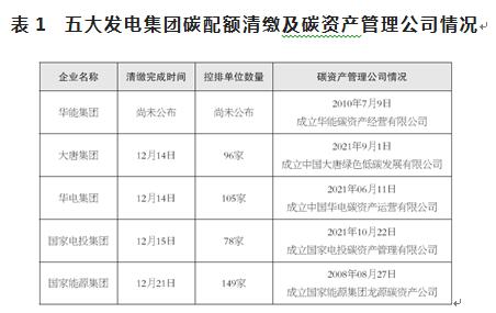 表1 五大發(fā)電集團(tuán)碳配額清繳及碳資產(chǎn)管理公司情況