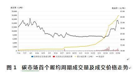 圖1 碳市場(chǎng)首個(gè)履約周期成交量及成交價(jià)格走勢(shì)