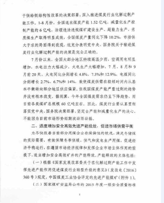9月30日,國家發展改革委、國家能源局、國家煤礦安監局聯合下發的《關于適度增加部分先進產能投放 保障今冬明春煤炭穩定供應的通知》(發改電〔2016〕605號)要求,在遵循市場經濟規律和發揮企業市場主體作用的前提下,適當增加安全高效先進產能釋放,以盡快改善當前部分用煤企業存煤偏低的狀況,滿足冬儲煤的實際需要,有效保障冬季供暖、供氣和發電生產用煤。