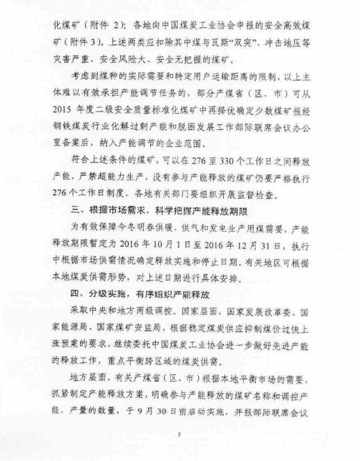 符合上述條件的煤礦,可以在276至330個工作日之間釋放產能,沒有參與產能釋放的煤礦仍要嚴格執行276個工作日制度。產能釋放期限暫定為2016年10月1日至2016年12月31日,執行中根據市場供需情況確定釋放實施和停止日期。
