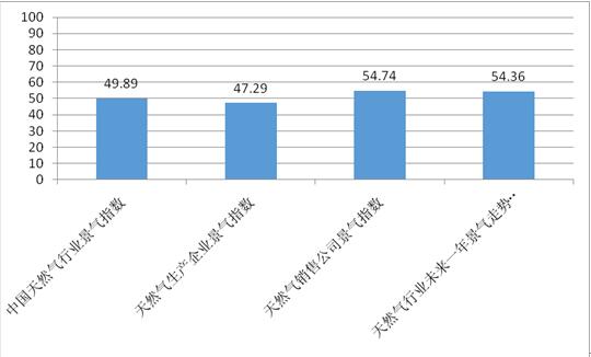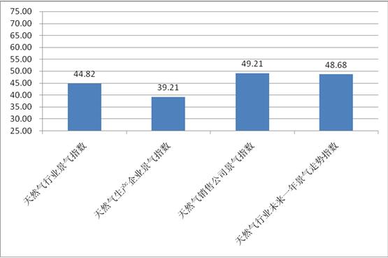 2016年2季度中國天然氣行業景氣指數為44.82,與2016年1季度的景氣指數44.06基本持平,處于較不景氣狀態。 2016年2季度天然氣生產企業景氣指數為39.21,相對于1季度生產企業景氣指數36.8略有上升,處于較不景氣狀態。從調查數據看,2季度生產企業的產能利用和天然氣產量有所上升。 2016年2季度國內天然氣銷售公司運營相對平穩,天然氣銷售公司景氣指數為49.21,相對于1季度的51.61略有下降,處于一般景氣狀態。 2016年2季度統計的未來一年天然氣行業景氣走勢指數為4 [詳細]