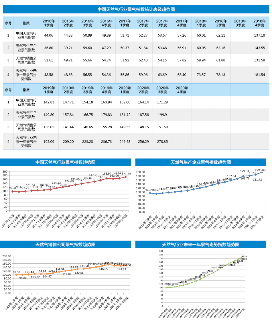 中國天然氣行業景氣指數統計結果顯示:2020年1季度中國天然氣行業景氣指數為162.00,處于景氣狀態;天然氣生產企業景氣指數為181.42,處于景氣狀態;天然氣銷售公司景氣指數為149.55,處于較景氣狀態;天然氣行業未來一年景氣走勢指數為245.48,處于非常景氣狀態。 [詳細]