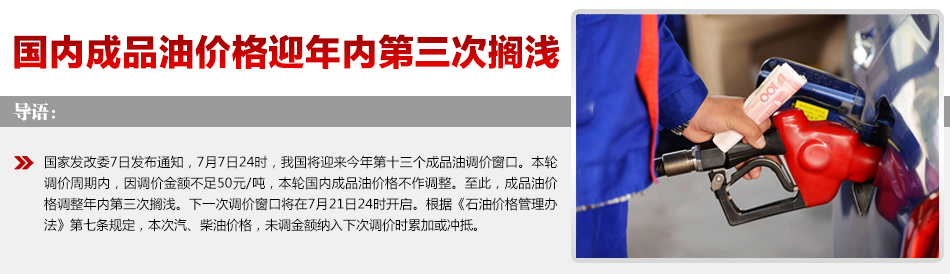2017年7月7日24時調價金額不足50元/噸,國內成品油價格不作調整
