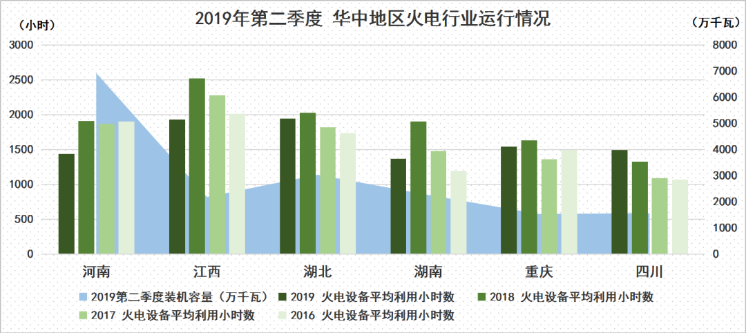 華中地區新增裝機容量增速差異較大,河南、江西、湖北火電裝機增長較為明顯,同比增幅達到332萬千瓦、142萬千瓦、260萬千瓦;湖南、重慶較去年同期出現了下滑,下滑幅度為1萬千瓦、9萬千瓦;四川扭轉下滑趨勢上漲了11萬千瓦。