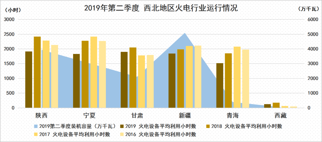 西北地區火電裝機容量較高,其中陜西是2019年上半年全國新增裝機容量最高的省份,達到765萬千瓦。裝機容量最高的新疆下滑了53萬千瓦,截至上半年裝機容量為5087萬千瓦。寧夏新增裝機容量334萬千瓦,增長幅度較大,甘肅、青海、西藏同比基本持平。