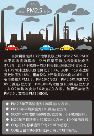 環境保護部于3月25日發布2013年重點區域和74個城市空氣質量狀況,顯示京津冀區域共13個地級及以上城市,空氣質量平均達標天數比例為37.5%,京津冀區域所有城市PM2.5和PM10年平均濃度均超標。