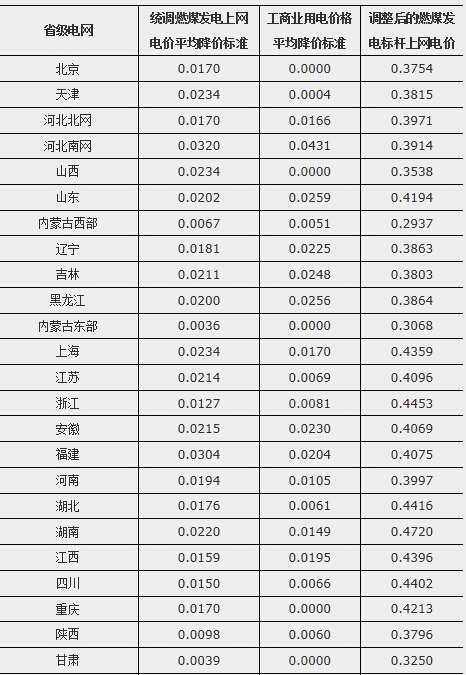 各省(區、市)燃煤發電上網電價和工商業用電價格調整表