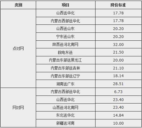 部分跨省、跨區域送電價格調整表